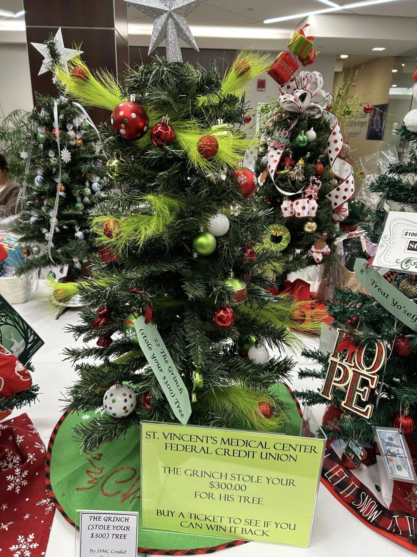 THANKS to YOU, we raised $8875 for cancer patients!! Thank you to everyone who participated in the Trim for the Swim! A special thank you to all the colleagues who coordinated this festive event and to all the departments at St. Vincent’s Medical Center who joined the fun by decorating a themed tree. Also a huge thanks to all who bought raffle tickets for a chance to win one the trees on display in the lobby of the Medical Center! YOU helped hundreds of cancer patients and their families with household expenses!
